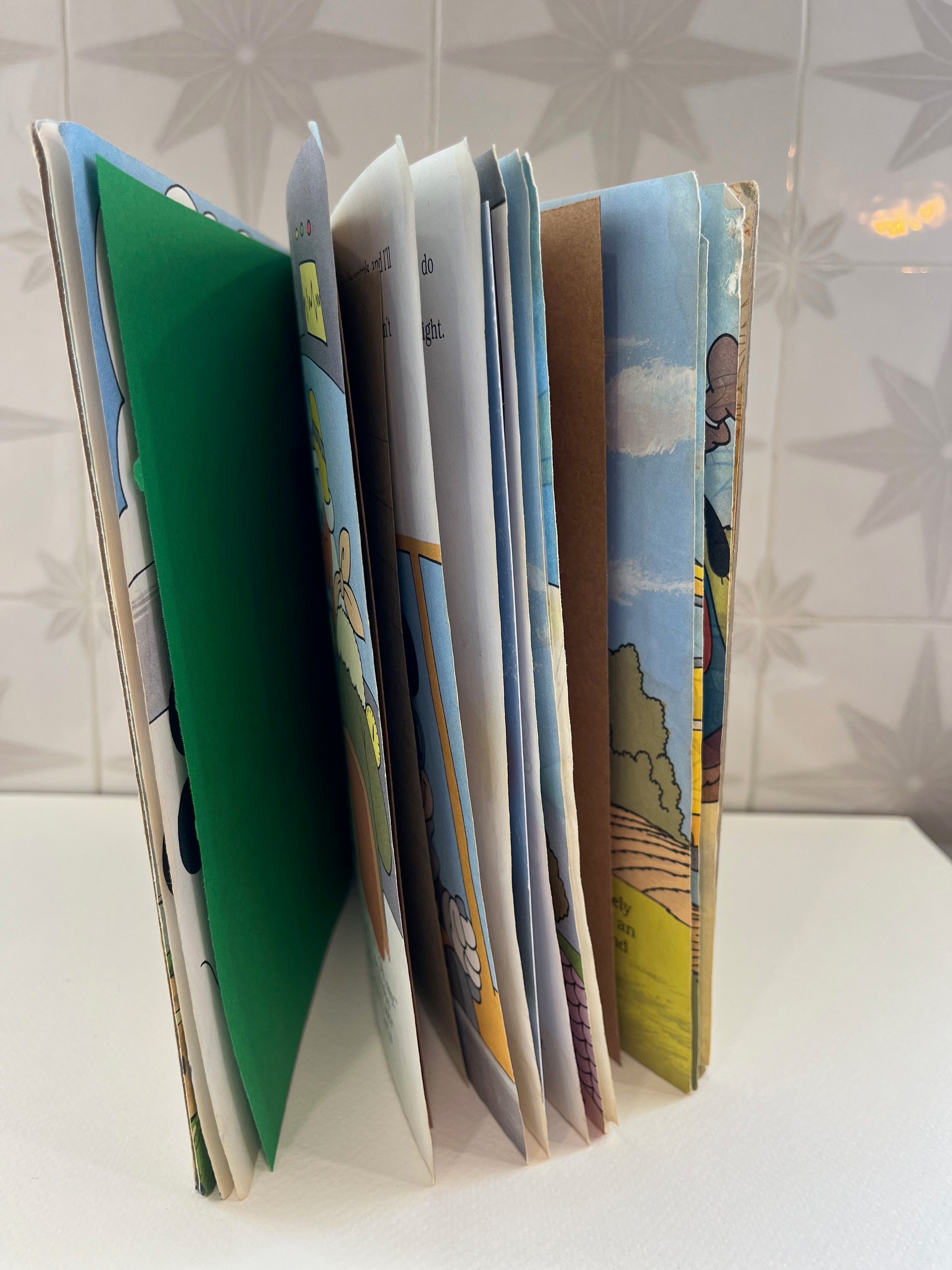 We cut off the spine and add a spiral binding coil in it's place. Then we add a variety of different papers: card stock, colorful paper, sheet music, dictionary pages, scrap paper, and whatever else we can find! Each spiral book is 30-40 pages, depending on what tickles our fancy (including the original book pages).